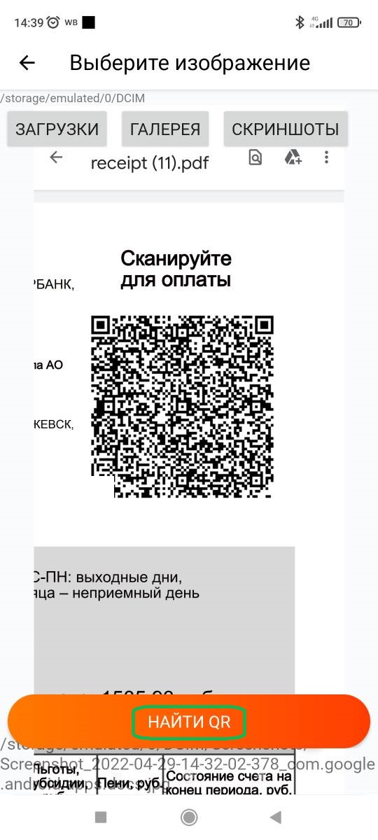 | Шаг 1.Сделайте скриншот QR-кода, по которому вам необходимо сделать оплату. Например, из личного кабинета поставщика услуг ЖКХ. | Шаг 2.В мобильном приложении ЭЛПЛАТ-ОНЛАЙН выберите "Оплатить по QR или СБП" и нажмите на кнопку "Из папки загрузки". | Шаг 3.На выбор появится три кнопки: "Загрузки", "Галерея", "Скриншоты". В нашем случае, скриншот сохранен в папке "Галерея". Нажмите кнопку "Найти QR" и подтвердите оплату. |